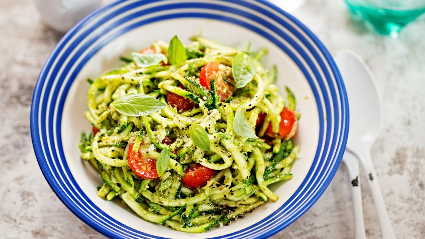 За този вариант ви трябва уред, който прави зеленчуците и плодовете във формата на спагети. Изберете тези, които ви се струват най-подходящи, но ако използвате тиквички, може да ги задушите за минута-две, за да омекнат, макар да не пречи да ги оставите и сурови.